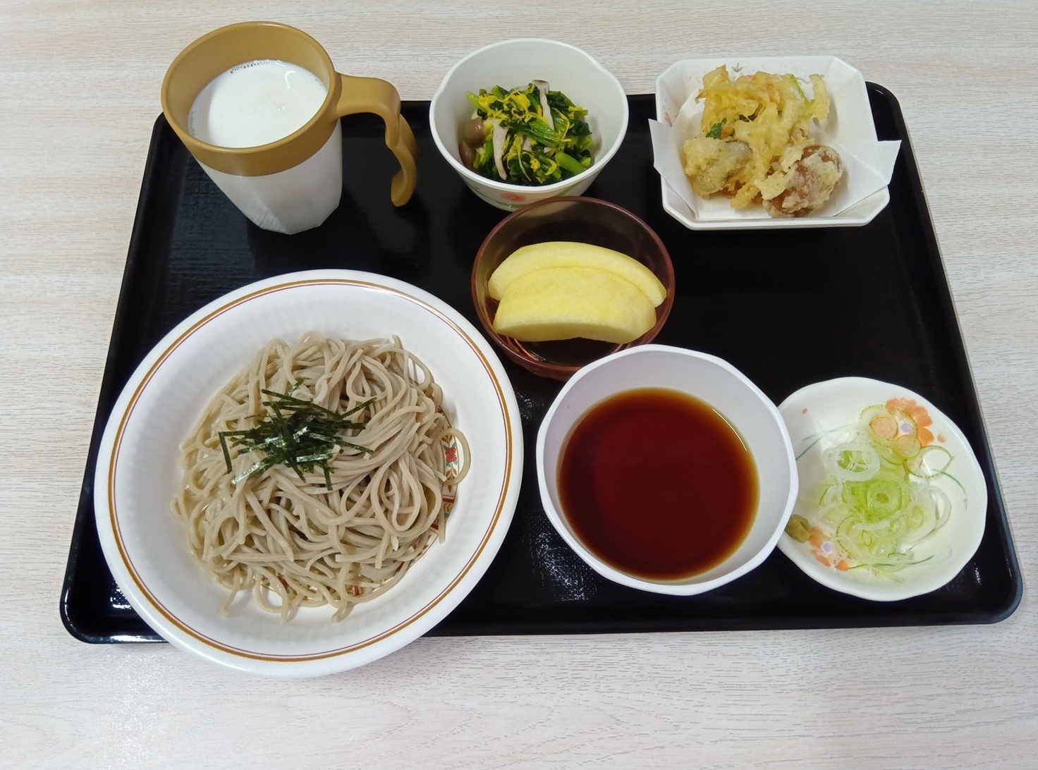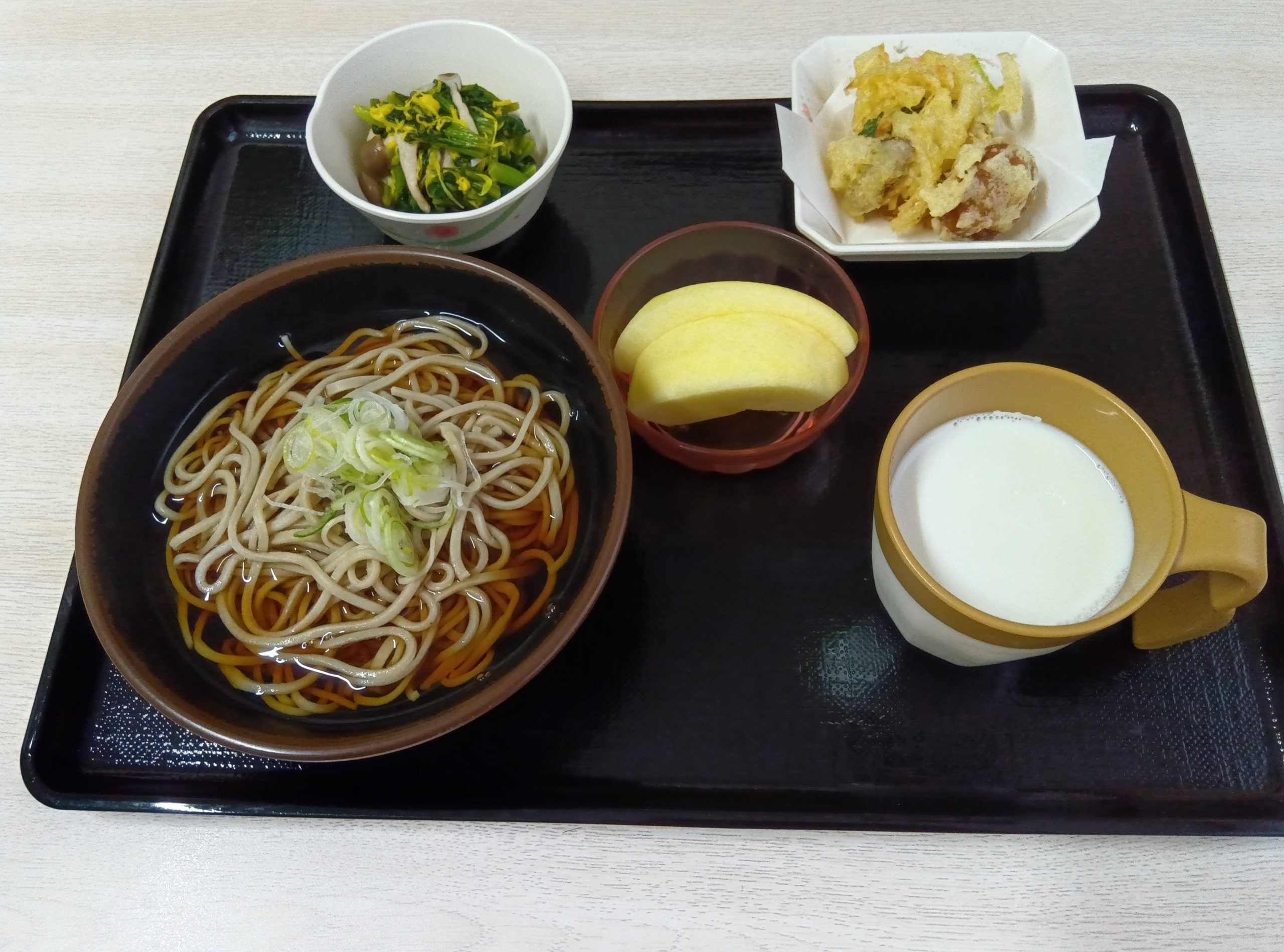 「蕎麦・かき揚げと天ぷらまんじゅう・小松菜と菊の酢の物・林檎・牛乳」です。